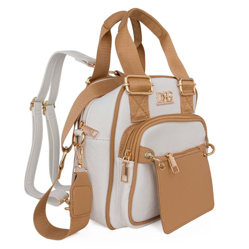 White women's backpack. Made of eco-leather. It features 2 interior compartments, one with a zipper, and 3 exterior compartments with zippers on the front and back. Adjustable, detachable shoulder straps, adjustable backpack straps, and a detachable adjustable crossbody strap. The wallet is detachable. Dimensions: H 25cm, W 23cm, D 15cm.*Designed exclusively in Greece by De Raggi designers."